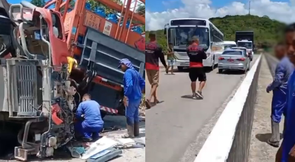 Uma colisão frontal entre um caminhão que transportava botijões de gás e uma caçamba carregada com brita foi registrada no início da tarde desta terça-feira (24), em um trecho da rodovia AL-105, no bairro Benedito Bentes, em Maceió.