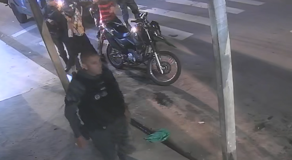 A câmera, instalada em uma residência, flagrou a ação enquanto os agentes abordavam dois homens em uma motocicleta.