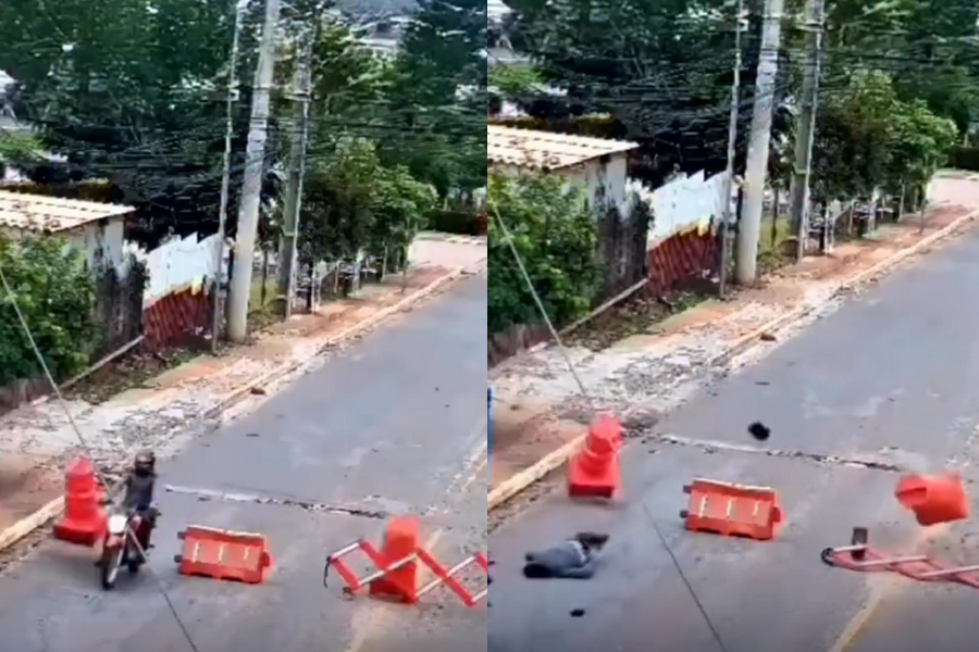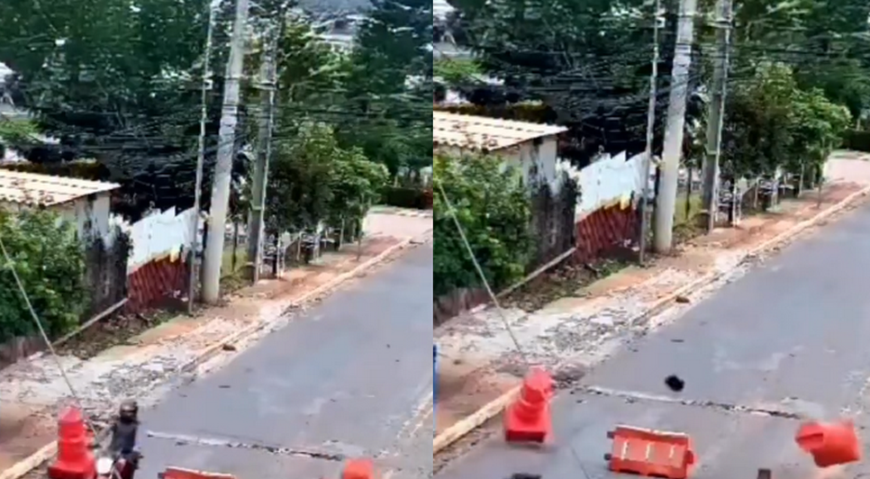 As imagens mostram que a vítima, um venezuelano, trafegava de motocicleta quando tentou passar por um espaço entre a sinalização e não percebeu a presença da barreira. Ao atravessar o local, ele foi atingido na região do pescoço e arremessado com violência.
