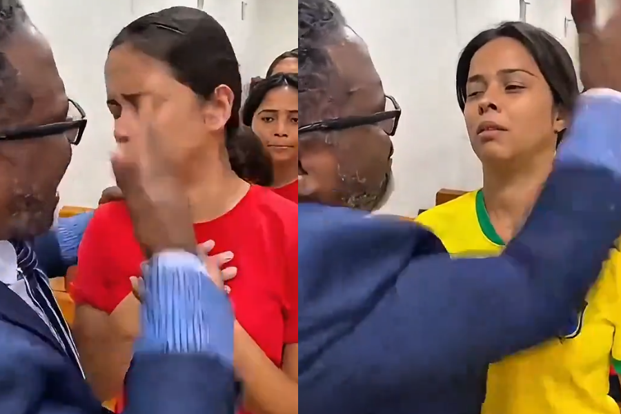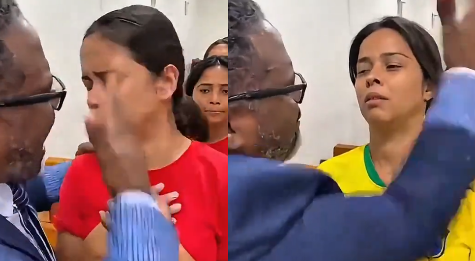 Nas imagens, um homem aparece batendo no rosto de mulheres, que estão usando camisas vermelhas com o símbolo do PT, enquanto repete a frase “Sai desse corpo, petista! Liberta essa mulher agora!”. No final do vídeo, a mulher surge vestindo uma camisa da seleção brasileira e o autor diz: “Agora está liberta. É verde e amarelo. Glória!”.