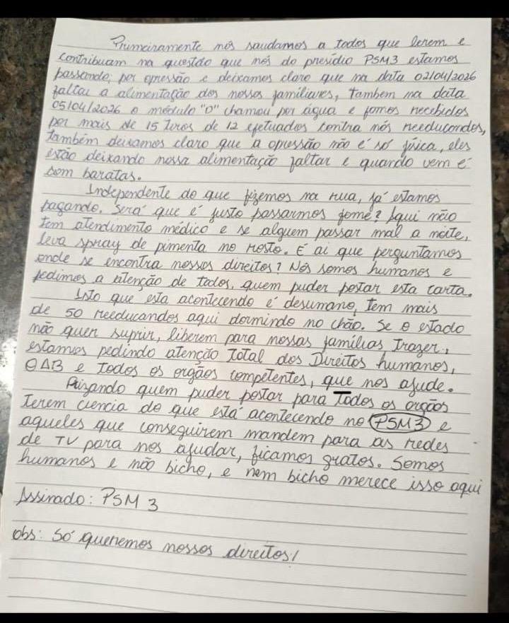O documento encerra com um pedido direto à OAB, às redes de televisão e a todos os órgãos de direitos humanos. "Somos humanos e não bichos, e nem bicho merece isso aqui", escrevem. A carta é assinada coletivamente como PSM 3, com uma observação final que resume o clamor dos internos: "Só queremos nossos direitos."