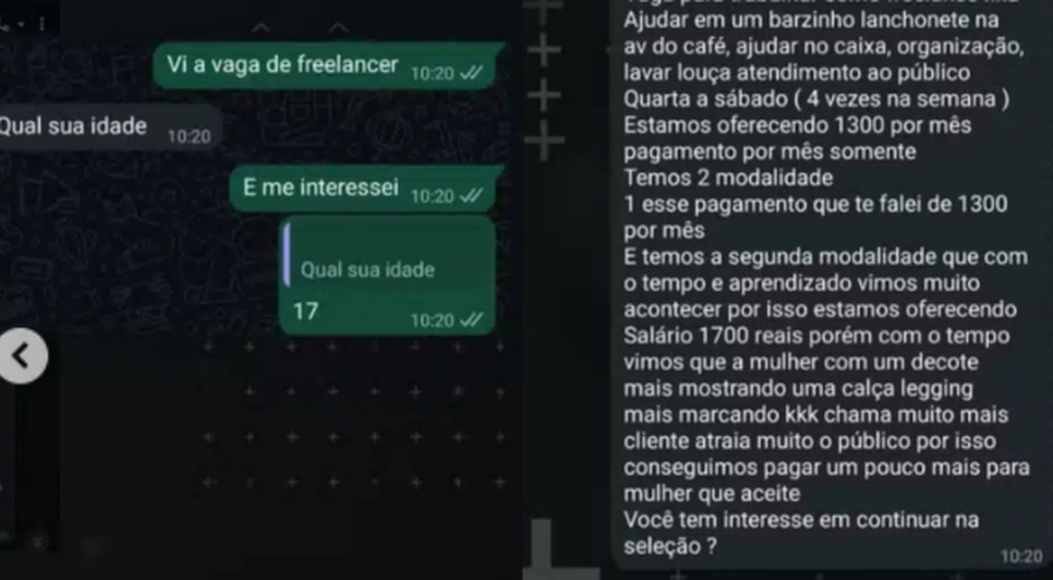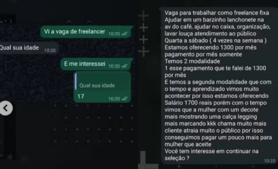 Uma adolescente de 17 anos denunciou uma hamburgueria em Ribeirão Preto após receber uma proposta de trabalho considerada abusiva durante processo seletivo.Segundo prints da conversa, o estabelecimento oferecia salário inicial de R$ 1.300, com um adicional de R$ 400 caso a jovem utilizasse roupas mais justas, como decote ou calça legging “marcando”, com o objetivo de atrair clientes.