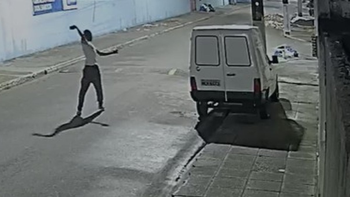 Em uma das gravações, o homem aparece caminhando pela rua antes de se abaixar, pegar duas pedras e arremessá-las contra um carro branco estacionado. Após a ação, ele deixa o local.