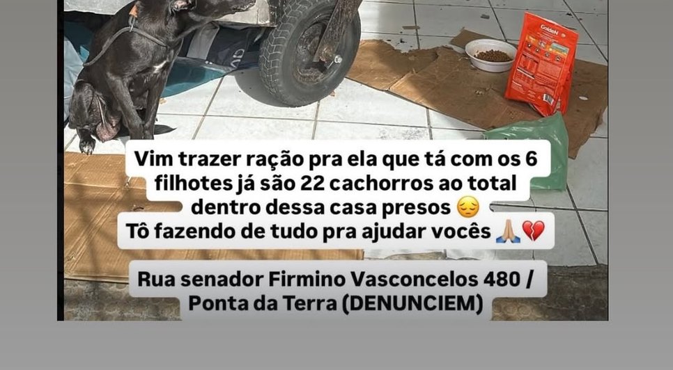 De acordo com as informações, os animais, incluindo filhotes, estariam vivendo em condições insalubres, sem alimentação adequada e sem cuidados básicos.