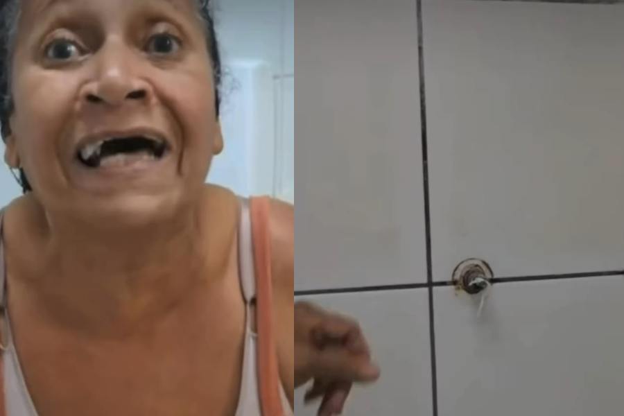 As imagens mostram a precariedade das instalações onde os acompanhantes permanecem: banheiro sem pia, sem torneira funcionando, chuveiro que precisa ser acionado com papel higiênico e ausência de cadeira de banho para toda a ala. "Eu já vi pessoas morrerem aqui. Olha a situação de onde eu tô morando", afirma a mulher enquanto mostra as condições do local.