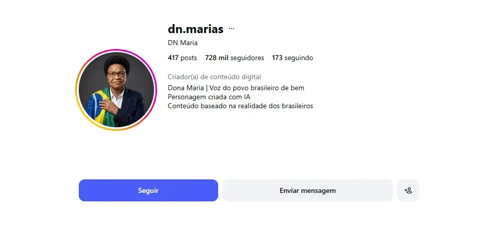 A personagem “Dona Maria” é retratada como uma mulher idosa e negra em formato realista, o que, segundo a representação, contribui para o alcance do conteúdo.