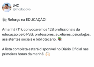 O prefeito de Maceió, João Henrique Caldas (JHC), anunciou nas redes sociais, nesta quinta-feira (11), a convocação de 128 profissionais da educação por meio do Processo Seletivo Simplificado (PSS).