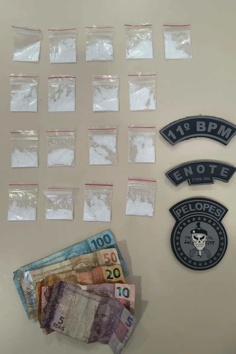 No Litoral Sul, equipes do 11º Batalhão atuavam no policiamento das festividades de Réveillon no Pontal do Peba, em Piaçabuçu, quando, por volta das 3h30, um homem foi preso por tráfico de drogas. Durante patrulhamento do Pelotão de Operações Policiais Especiais (Pelopes), os militares identificaram um grupo em atitude suspeita. Um dos indivíduos tentou fugir e descartar o material, mas foi alcançado. Com ele, foram apreendidas 17 porções de cocaína e R$ 165 em dinheiro. O suspeito foi encaminhado à Delegacia Regional de Penedo e autuado em flagrante.