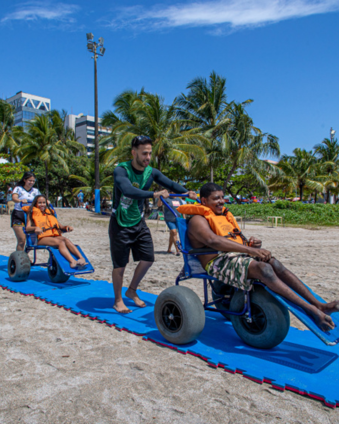 As “cadeira anfíbias” permitem acesso de pessoas com deficiência á praia. Os equipamentos contam com cintos reguláveis, rodas especiais, encosto, apoio cervical para a cabeça e para os pés. Os agendamentos para os fins de semana e feriados podem ser realizados através do número (82) 99102-4596