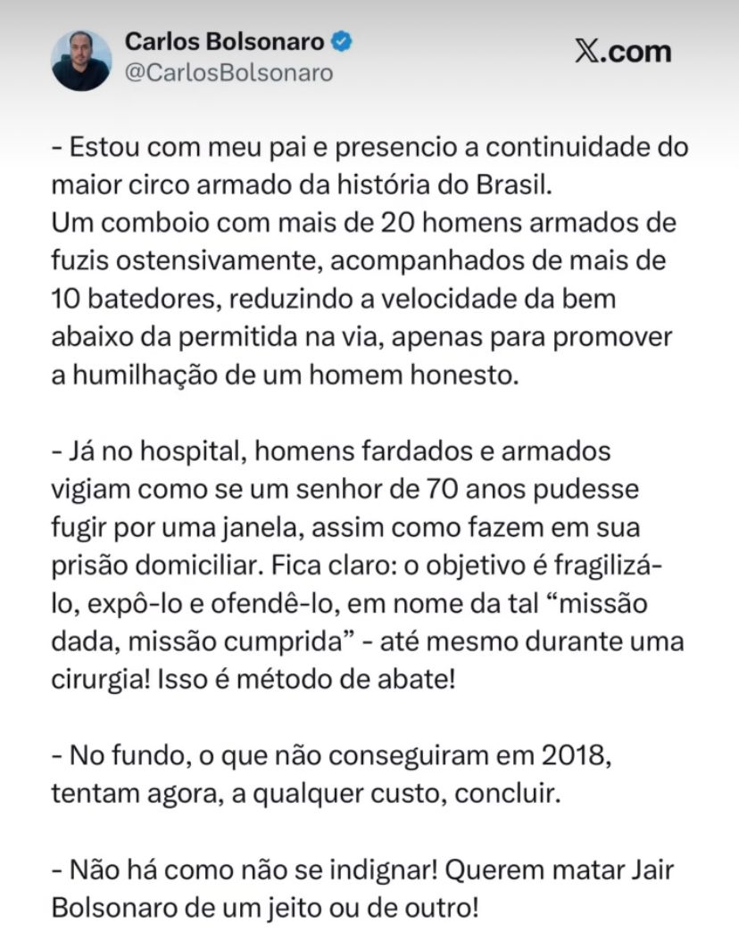 O vereador do Rio de Janeiro, Carlos Bolsonaro (PL), criticou a operação que foi feita para acompanhar a ida do seu pai e ex-presidente Jair Bolsonaro ao hospital. Essa é a primeira vez que Bolsonaro sai de sua residência desde que foi decretada sua prisão domiciliar em 04 de agosto e desde que saiu sua condenação por tentativa de golpe de estado.