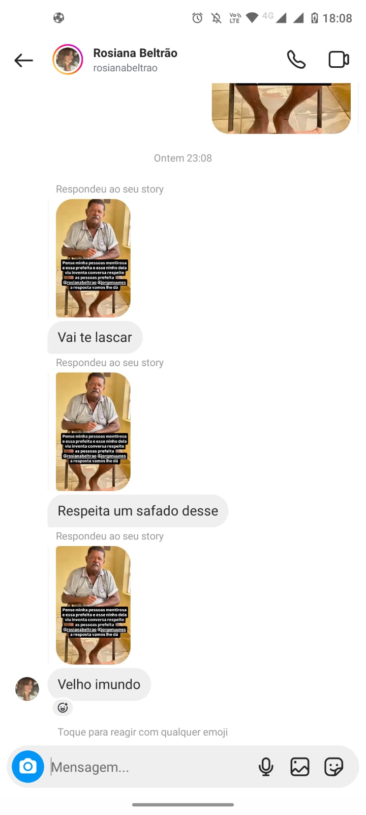A prefeita de Feliz Deserto, Rosiana Beltrão, xingou um morador de “velho imundo” após ele publicar um vídeo nas redes sociais chamando ela de mentirosa e desmentindo suas falas feitas durante um comício. Em um print que o Agora! Alagoas teve acesso, Rosiana manda o morador “se lascar” e o chama de ‘velho imundo” ao, ironicamente, pedir respeito.